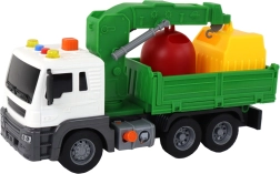 Interaktywny żuraw na dachu podnosi się po naciśnięciu pomarańczowego przycisku, dzięki czemu dzieci mogą załadowywać i rozładowywać kontenery. W zestawie są 2 kolorowe kosze oraz 4 kartoniki z typami odpadów, które w przystępny sposób uczą recyklingu i ekologii. Kompaktowe wymiary są idealne do zabawy w domu i na zewnątrz.