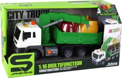 Ta zielona dziecięca zabawka śmieciarka z żurawiem dostarcza mnóstwo akcji i nauki. Dzięki napędowi frykcyjnemu wystarczy pociągnąć auto do tyłu i puścić – pojedzie samo do przodu. Efekty dźwiękowe (klakson, rozruch silnika, cofanie) potęgują realizm i rozwijają wyobraźnię.