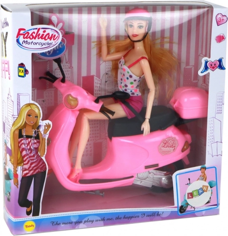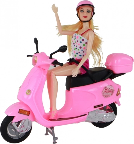 Urocza lalka na różowym skuterze zapewnia godziny kreatywnej zabawy. Ma długie blond włosy, zdejmowany różowy kask oraz ruchome ręce i nogi. Różowy skuter z obracającą się kierownicą i jeżdżącymi kołami wspiera zabawy w udawanie i bezpieczną jazdę dzięki mocowaniu lalki. Odpowiednie dla dzieci od 3 lat, certyfikat CE i zgodność z EN71.