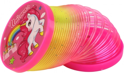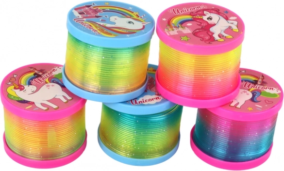 Zabawna tęczowa sprężyna z motywem jednorożców i zintegrowaną diodą LED, która tworzy magiczny efekt świetlny. Dzięki talerzykom na końcach nie plącze się, doskonale świeci w ciemności i zapewnia mnóstwo zabawy dzieciom od 3 lat. Certyfikaty CE i norma EN71 gwarantują bezpieczną zabawę.