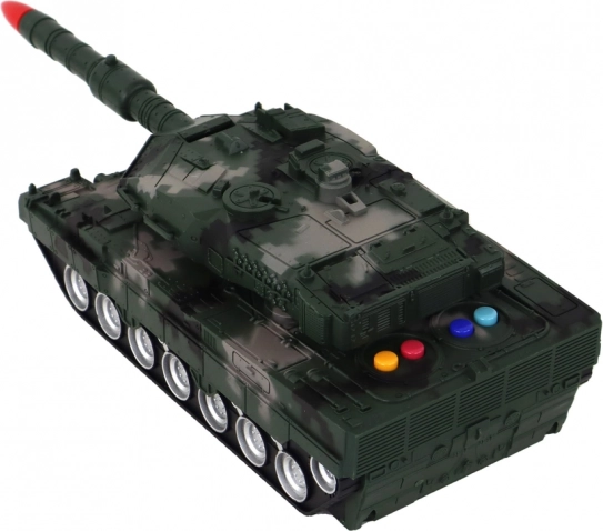 Czołg jest wyposażony w rakiety i różnokolorowe przyciski do strzelania i zmiany muzyki, co dodaje więcej interaktywnych elementów do zabawy.