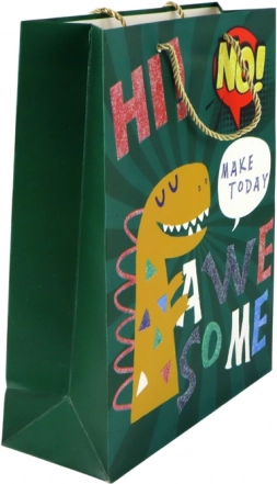 Stylowa papierowa torba prezentowa w ciemnozielonym kolorze z wesołym motywem dinozaura i delikatnymi drobinkami brokatu. Dzięki solidnym złotym sznurkowym uchwytom jest praktyczna, wytrzymała i świetnie sprawdzi się na urodziny, przyjęcia dla dzieci oraz święta.
