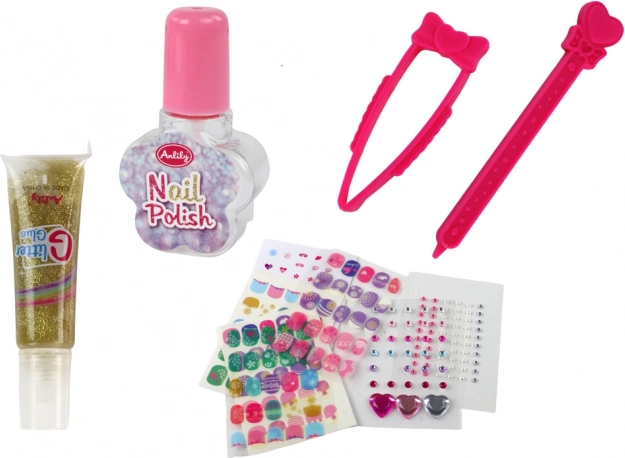 - Dziecięce tipsy, naklejki, lakier/brokat i podstawowe narzędzia do zdobienia paznokci