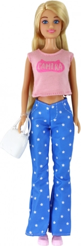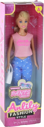 Stylowa lalka ANLILY z długimi blond włosami ma na sobie różowy top, niebieskie spodnie w gwiazdki i różowe tenisówki. W zestawie znajdują się biała torebka i niebieskie okulary do kreatywnego stylizowania. Wymiary lalki 30 × 7 × 5 cm, opakowania 32 × 11 × 5 cm. Certyfikacja CE, norma EN71, odpowiednia od 3 lat.