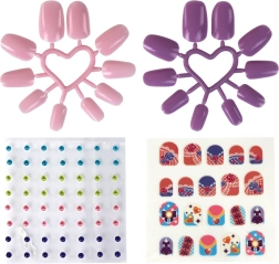 Zawiera sztuczne paznokcie, naklejki oraz lakiery do paznokci w dwóch kolorach do różnych stylizacji.