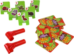 Do przygotowania gry należy złożyć maski (dla uśmiechniętej twarzy kameleona montujemy gumki i rozkładane trąbki). Składamy również zielone (z drugiej strony czerwone) karty, aby można je było ustawić pionowo.