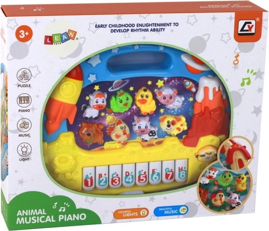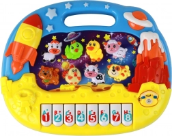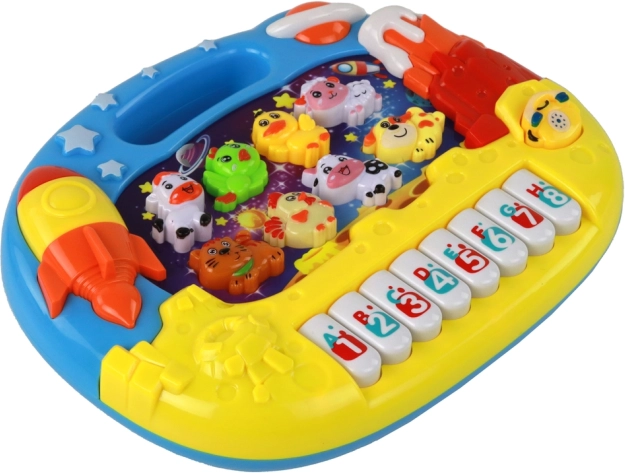 - Motyw kosmosu rozwija dziecięcą wyobraźnię i łączy klawisze z odgłosami zwierząt oraz liczbami.