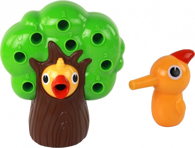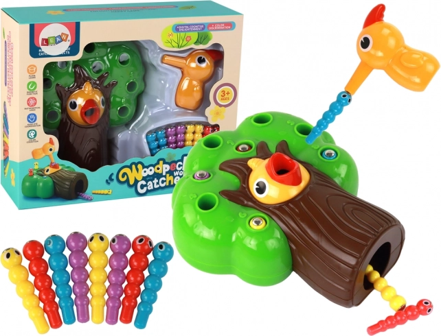 W zestawie: drzewko z otworami, magnetyczny ptaszek do wyciągania robaczków, kolorowe robaczki oraz pisklę/gniazdko do „karmienia”.