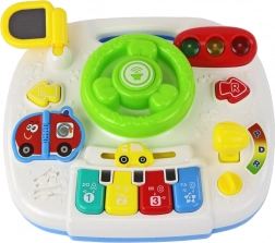 Dziecięca kierownica z klaksonem, kierunkowskazami i sygnalizacją świetlną uczy podstawowych zasad ruchu drogowego i poprawia koordynację ruchową w formie zabawy.
