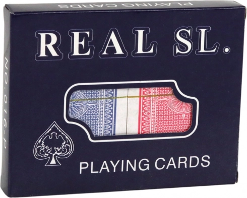 Karty są przechowywane w eleganckim pudełku z napisem 'REAL SL. PLAYING CARDS', które zapewnia ich ochronę i stylowy wygląd.