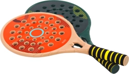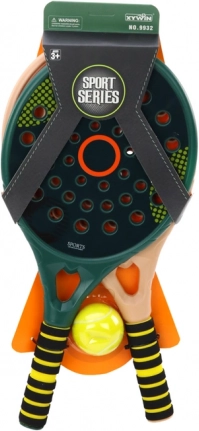 .Rączki rakiet w kontrastowych kolorach czarnym i żółtym wykonane są z miękkiego tworzywa, co zapewnia wygodny chwyt i zwiększa komfort. Wymiary paletek to 46 cm x 22 cm x 3 cm, co gwarantuje stabilność i precyzję podczas gry.