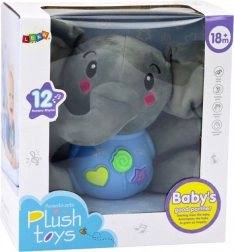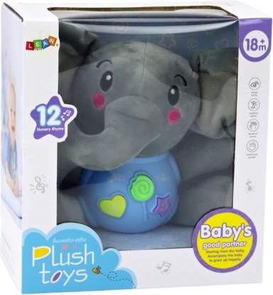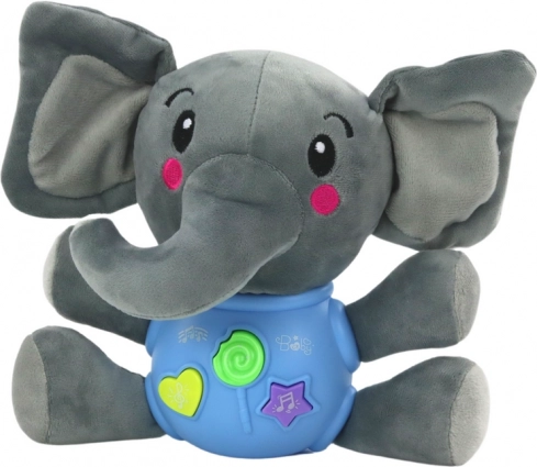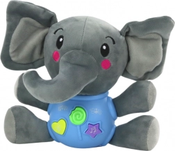 Uroczy interaktywny pluszowy słoń w niebieskim kolorze (19 cm) z miękkiego materiału oferuje trzy przyciski: dźwięki natury, angielskie rymowanki oraz 5 wesołych melodii. Świetna zabawka wspierająca rozwój zmysłów i języka od 18 miesięcy, zasilanie 2× AA.