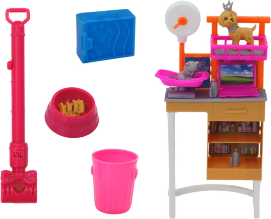 W komplecie różne akcesoria: stacja robocza/groomingowa z półkami i posłankiem, miski do karmienia, odkurzacz, kosz, transporter oraz duży plastikowy piesek na smyczy na „spacery”. W zabawny sposób rozwija motorykę małą, umiejętności społeczne i wyobraźnię.