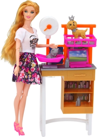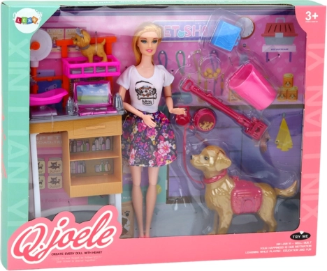 Ten kolorowy zestaw łączy świat fantazji i nauki – lalka w kwiecistej sukience opiekuje się psami i kotem: kąpie je, czesze, waży i karmi. Dzieci wcielają się w rolę opiekuna i małego weterynarza oraz uczą się, że częścią opieki jest także sprzątanie po pupilach.