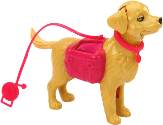 Duży plastikowy piesek ze smyczą i pojemnikiem zachęca do aktywnej zabawy i pokazuje, że do opieki nad pupilami należy także wyprowadzanie i sprzątanie.