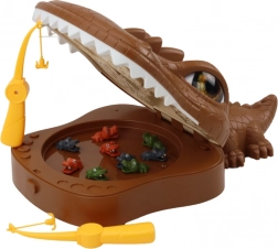 Duża plansza w kształcie brązowego krokodyla z otwieraną paszczą, ruchomymi elementami i kolorowymi „zdobyczami” dla nieskończonej zabawy.