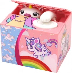 W górnej części skarbonki znajduje się duży biały przycisk do wkładania monet. Gdy dziecko położy monetę na przycisku i go naciśnie, rozbrzmiewa wesoła melodia, a z pudełka w górnej części wysuwa się uroczy jednorożec, który zabiera monetę do środka skarbonki. Dzięki temu efektowi dźwiękowemu i wizualnemu zabawa jest jeszcze ciekawsza i bardziej motywująca.