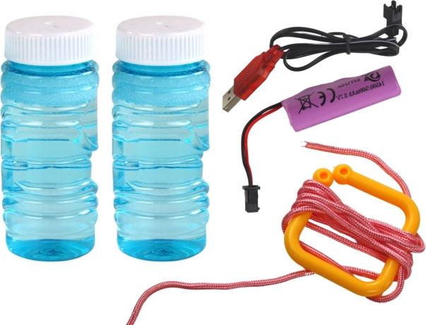 Zawiera dwie niebieskie butelki z płynem do tworzenia baniek, kabel ładujący oraz inne elementy, co czyni tę Biedronkę kompletnym produktem gotowym do użycia od razu.