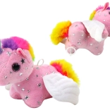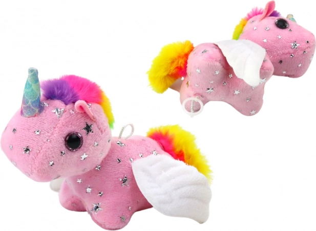 Pluszowy jednorożec to czarująca zabawka, która przeniesie dzieci do świata magii. Dzięki nakręcanemu sznureczkowi jednorożec po puszczeniu radosnie podskakuje i merda ogonkiem, co jeszcze bardziej potęguje zabawę. Delikatne różowe futerko ze srebrnymi gwiazdeczkami, kolorowa grzywa i białe skrzydełka nadają zabawce magiczny wygląd.