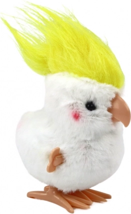 Urocza nakręcana papuga kakadu w białym kolorze z żółtym czubem wnosi radość, ruch i dekoracyjny urok do pokoju dziecka. Dzięki miękkiej pluszowej powierzchni i solidnemu wykonaniu jest idealna do zabawy oraz jako miła ozdoba. Po nakręceniu papuga wesoło podskakuje, co gwarantuje uśmiech każdemu dziecku.