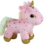 Miękki różowy materiał ze złotymi gwiazdkami i błyszczącymi detalami czyni z jednorożca uroczego towarzysza i dekorację.