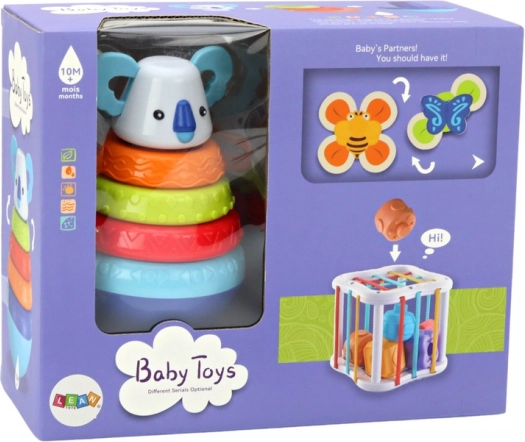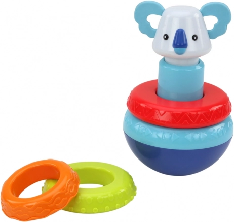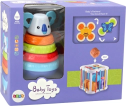 W skład zestawu wchodzą trzy zróżnicowane elementy, z których każdy oferuje dziecku wyjątkowe doświadczenia i wyzwania. Wieża z koalą i kółkami pomaga nie tylko rozwijać motorykę małą poprzez umieszczanie kółek we właściwych miejscach, ale także zapewnia zabawę dzięki kołyszącemu się ruchowi koali.