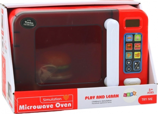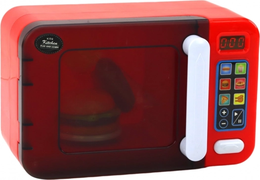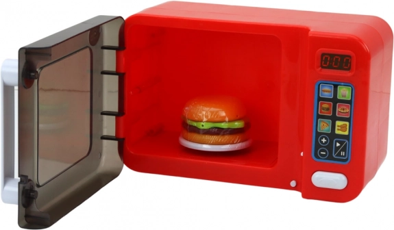 Interaktywna dziecięca kuchenka mikrofalowa w czerwonym kolorze zamieni zabawę w kuchni w realistyczne doświadczenie. Oferuje efekty świetlne, obracający się talerz, otwierane drzwiczki i programy podgrzewania. W zestawie znajdują się akcesoria – hamburger, frytki i hot dog. Bezpieczna zabawa dla dzieci od 3 lat, zasilana 3× AA (w zestawie).