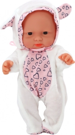 Białe ubranko ze wzorem serduszek oraz kaptur z uszkami nadają laleczce wyjątkowy, delikatny wygląd, który dzieci uwielbiają.