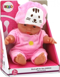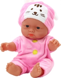 Ta mała laleczka niemowlę zachwyca miłym wyglądem i starannym wykonaniem. Dzięki kompaktowym wymiarom łatwo mieści się w dziecięcej rączce i jest idealna w podróży oraz do codziennej zabawy. Różowe ubranko z żółtymi guziczkami i czapeczka z uszkami w stylu króliczka dodają laleczce wyjątkowego uroku.