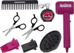 Centralnym elementem zestawu jest suszarka w różowym kolorze, która dodaje zabawce uroku i atrakcyjności. Suszarka jest zasilana dwiema bateriami, co pozwala realistycznie symulować suszenie włosów, gdy wydmuchuje strumień powietrza. Dodatkowo posiada trzy różne nasadki, umożliwiające różne style suszenia, co wprowadza do zabawy element zmienności i kreatywności.