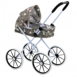 Stylowy wózek dla lalek w szarym kolorze z motywem gwiazdek ucieszy każdą małą opiekunkę. Ma duże piankowe koła dla płynnej jazdy, składaną budkę i łatwo się składa do przechowywania i przenoszenia. Wspiera kreatywną zabawę, empatię i rozwój umiejętności społecznych.