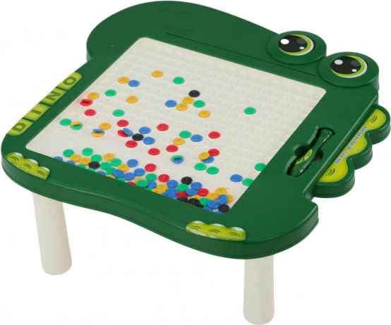 Tablica zawiera przezroczysty panel, za którym znajdują się kolorowe koraliki z magnesami. Koraliki w kolorach czarnym, zielonym, niebieskim, czerwonym i żółtym umożliwiają tworzenie różnorodnych obrazków, co wspiera dziecięcą kreatywność i wyobraźnię. W zestawie znajduje się magnetyczny długopis, który ułatwia tworzenie obrazków i zwiększa frajdę z zabawy.