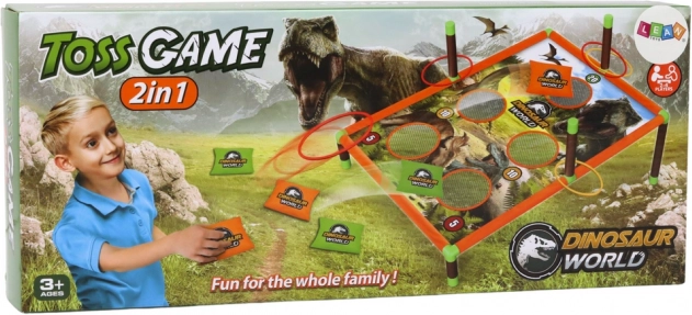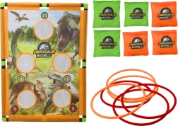 Grę tworzy solidna, kolorowa tablica do gry ozdobiona obrazkami różnych dinozaurów, która nie tylko wspiera zabawę, ale również pobudza dziecięcą wyobraźnię. Plansza zawiera system punktacji, który wprowadza do zabawy element rywalizacji i emocji. W zestawie znajdują się także specjalnie zaprojektowane woreczki do rzucania zapewniające stabilność lotu i celne trafienia, a także obręcze.