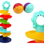 Głównym elementem wieży jest spiralna konstrukcja. Twoje dziecko może wypuszczać kulki z najwyższego poziomu i obserwować, jak ich droga toczy się w dół po spirali. Ta zabawa rozwija umiejętność obserwacji i logiczne myślenie.