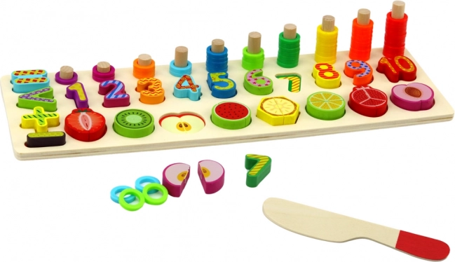 Cechy produktu:- Wydrążone miejsca z cyframi i kolorowymi owocami są idealne do nauki liczenia, rozpoznawania kształtów i kolorów oraz rozwijania koordynacji wzrokowo-ruchowej.