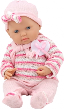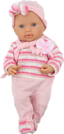 Urocza lalka niemowlę w różowym prążkowanym sweterku z czapeczką i szalikiem ucieszy każdą małą opiekunkę. Ma realistyczne rysy oraz ruchome ręce i nogi, wykonana jest z bezpiecznych i trwałych materiałów. Wymiary lalki 39 × 18 × 10,5 cm, wiek 18+ miesięcy, certyfikaty CE i EN 71.
