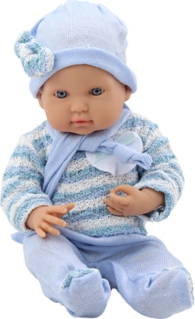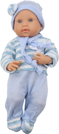 Urocza laleczka niemowlę w niebieskim prążkowanym sweterku, z czapeczką i szalikiem, ucieszy każdą małą opiekunkę. Oferuje realistyczne wykonanie, ruchome ręce i nogi oraz miękkie, dziane ubranka z bezpiecznych materiałów. Idealna zabawka dla dzieci od 18 miesięcy.