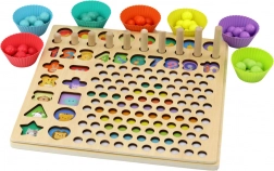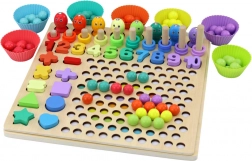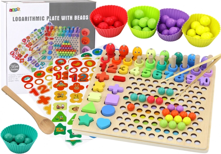 Zestaw składa się z różnych elementów, takich jak łowienie rybek za pomocą wędki z magnesem, układanie koralików we właściwych miejscach, nakładanie odpowiedniej liczby obręczy na każdy słupek oraz porządkowanie brył przestrzennych. Dziecko może w ten sposób ćwiczyć różne umiejętności, takie jak rozpoznawanie kształtów, liczenie, dopasowywanie oraz rozwój motoryki i koordynacji ręka-oko.