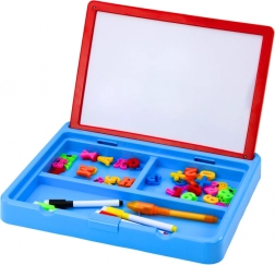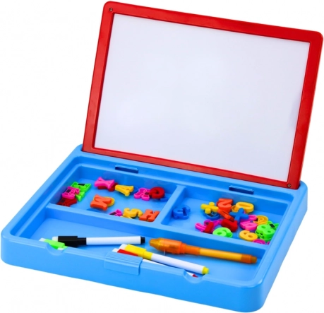 Pod tablicą znajduje się praktyczny schowek z 3 przegródkami na wszystkie akcesoria – markery, magnetyczne litery i cyfry wchodzą w skład zestawu. Dwustronna konstrukcja umożliwia wiele sposobów tworzenia i nauki, a dzięki łatwemu ścieraniu dzieci mogą tworzyć wciąż na nowo.