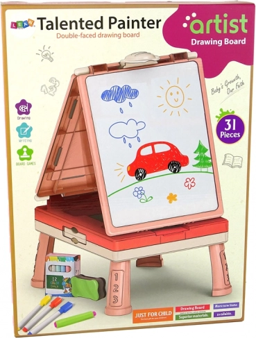 Wielofunkcyjna dziecięca tablica 3w1 łączy kreatywne rysowanie i zabawną naukę w jednym. Oferuje dwustronną powierzchnię do kredy i markerów, praktyczny stolik oraz zintegrowane gry planszowe, takie jak „Chińczyk” i Węże i drabiny. Świetny wybór dla rozwoju kreatywności, małej motoryki i logicznego myślenia dzieci od 3 lat.