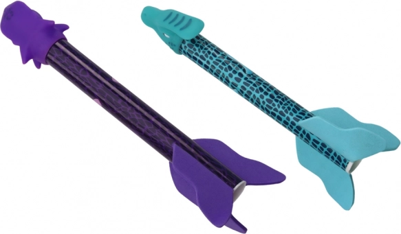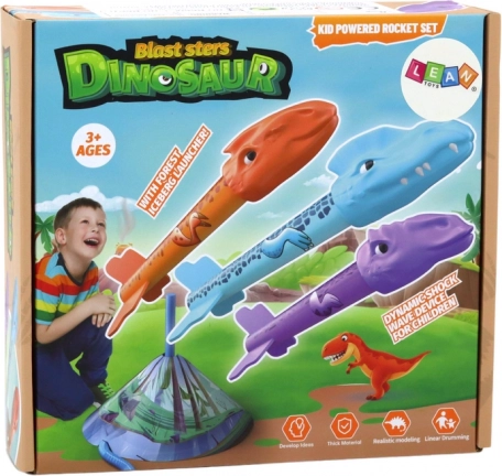 Zestaw zawiera trzy rakiety w kształcie dinozaurów w różnych kolorach (pomarańczowy, niebieski, fioletowy), co zapewnia różnorodną zabawę.