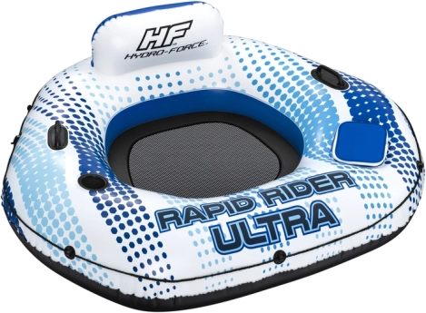 Wysokie, dmuchane oparcie odciąża plecy i kark, a siatkowe dno przyjemnie chłodzi — idealne połączenie na długie godziny relaksu na wodzie.