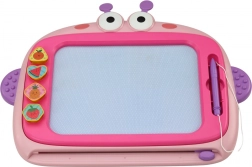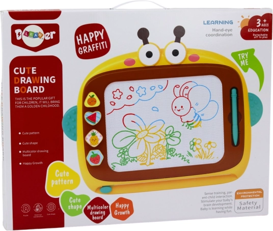 Magnetyczna tablica jest idealna do pierwszych rysunków, pisania i prostych zadań edukacyjnych. Pod ekranem znajdują się metalowe drobinki, które pod wpływem dotyku magnetycznego długopisu układają się w obrazki w czterech kolorach (niebieski, żółty, zielony, czerwony). Wystarczy przesunąć suwak do wymazywania, a powierzchnia znów jest czysta – bez papieru i bałaganu.