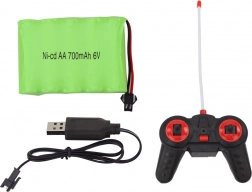 Kontroler z dwoma drążkami zapewnia płynne kierowanie, przyspieszanie i hamowanie. W zestawie znajdziesz także akumulator 6 V i ładowarkę USB.