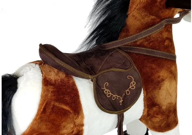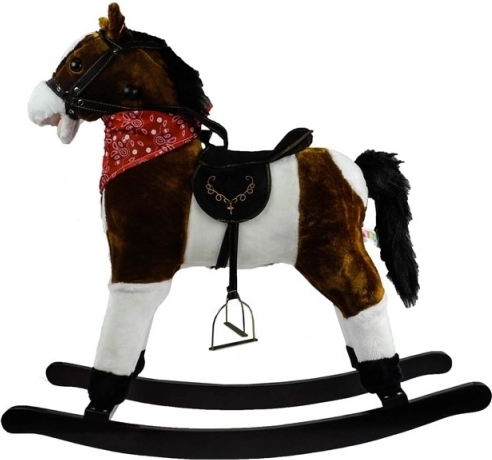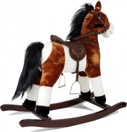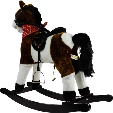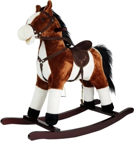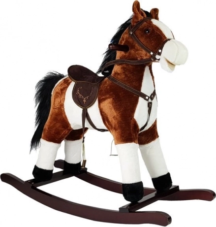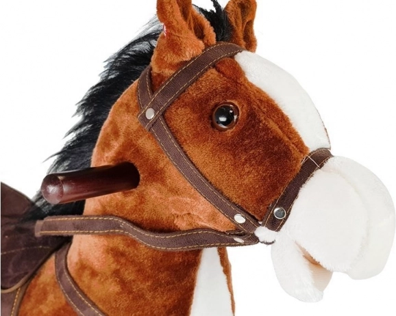 Nasz ciemnobrązowy koń na biegunach wykonany jest z miękkiego pluszowego materiału, który zapewnia wygodę podczas długiej zabawy. Koń wyposażony jest w realistyczne dźwięki aktywowane naciśnięciem ucha, ożywiające atmosferę Dzikiego Zachodu odgłosami rżenia i galopu.