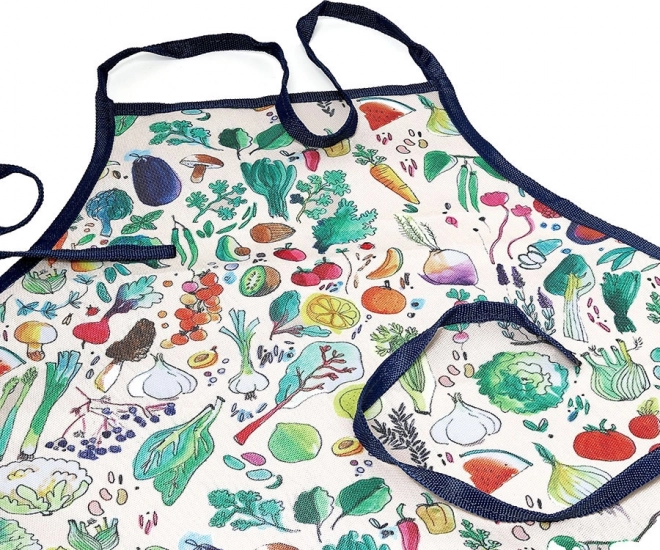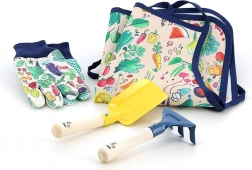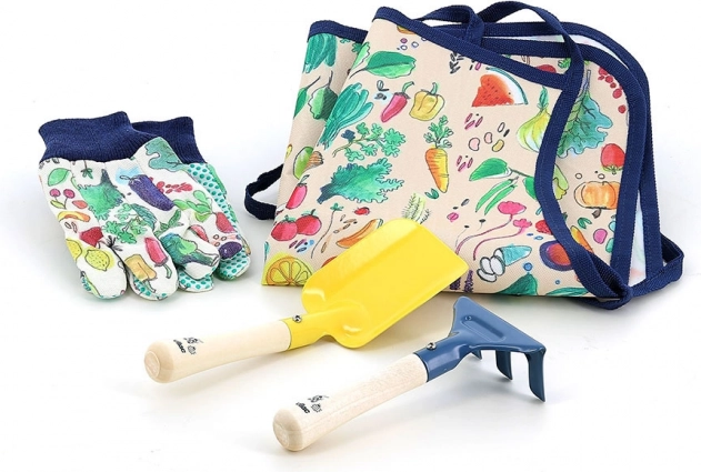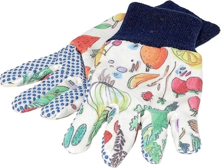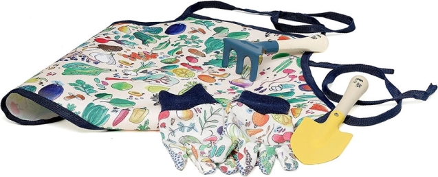 Kolorowe wzory na fartuszku i rękawicach sprawiają, że ogrodnictwo staje się radosną aktywnością.