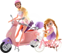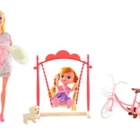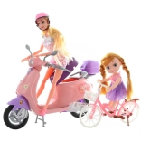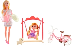 - Duża lalka 30 cm (przegubowa), mała lalka 16 cm, samochód 33 cm, skuter 30 cm, rower 17 cm, huśtawka, piesek, kapelusz, kask, torba na zakupy