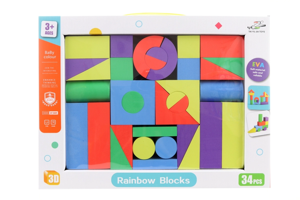 Klocki z twardszej pianki o różnych kształtach i kolorach. Pakowane w pudełku. Wymiary opakowania ok. 37,5 × 26,5 × 4,5 cm. Wiek 3+