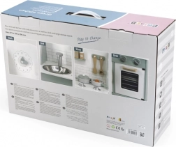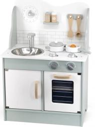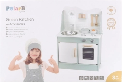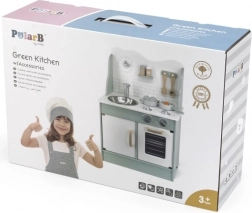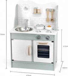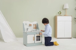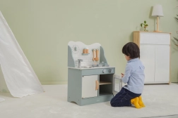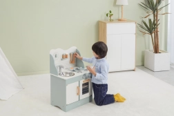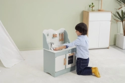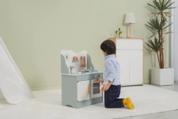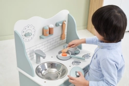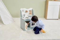 Po zakończeniu gotowania dzieci mogą umyć naczynia w zlewie i schować żywność do szafki schowkowej pod zlewem. Kuchnia dla dzieci wykonana jest z lakierowanego drewna i pomalowana nietoksycznymi farbami w „polarnych” tonacjach. Wspiera odpowiedzialność i organizację podczas zabawy.