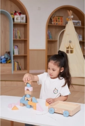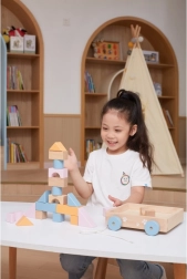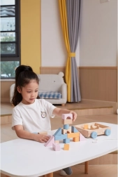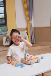 Klocki są wykonane z drewna bukowego, pomalowane w harmonijnych kolorach i bezpieczne dla dzieci. Po zabawie klocki można schować z powrotem do wózka, co umożliwia łatwe porządkowanie. Dzięki sznurówce dziecko może ciągnąć wózek z klockami po podłodze, co jest nie tylko zabawne, ale i praktyczne.